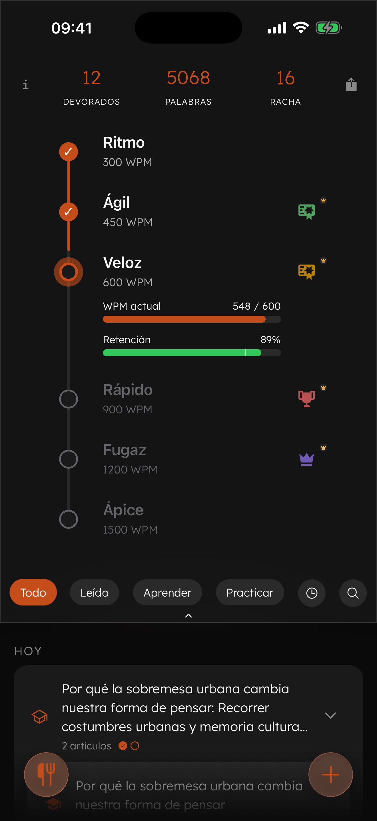 Lo que ahora te resulta incómodo se sentirá natural en pocas sesiones. Velocidades que hoy parecen imposibles, como 900 o incluso 1200 palabras por minuto, se vuelven alcanzables con práctica. Imagina cuánto podrías aprender a esas velocidades.