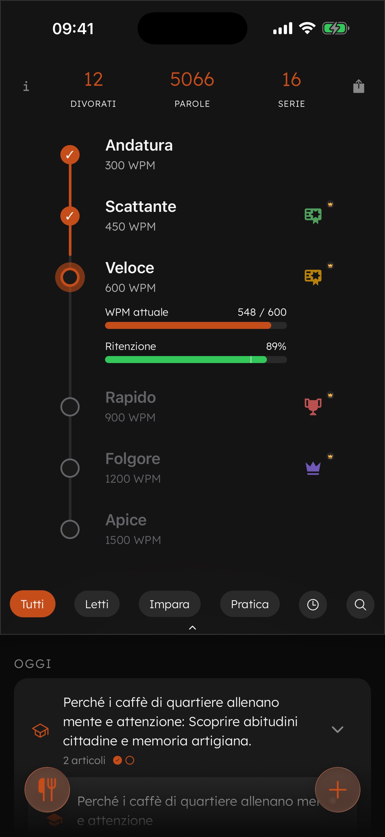 Quello che ora ti sembra scomodo diventerà naturale dopo poche sessioni. Velocità che oggi sembrano impossibili, come 900 o addirittura 1200 parole al minuto, diventano raggiungibili con la pratica. Immagina quanto potresti imparare a quelle velocità.
