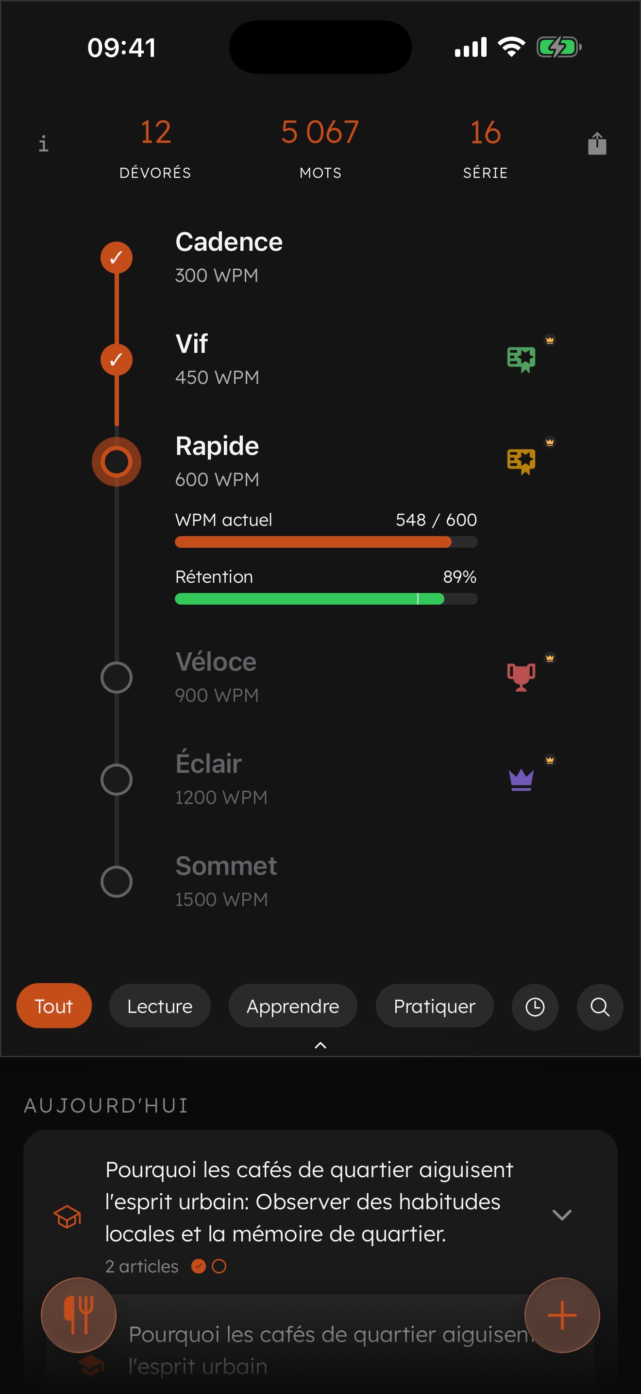 Ce qui vous semble inconfortable maintenant deviendra naturel en quelques sessions. Des vitesses qui paraissent impossibles aujourd'hui, comme 900 voire 1200 mots par minute, deviennent accessibles avec de la pratique. Imaginez tout ce que vous pourriez apprendre à ce rythme.